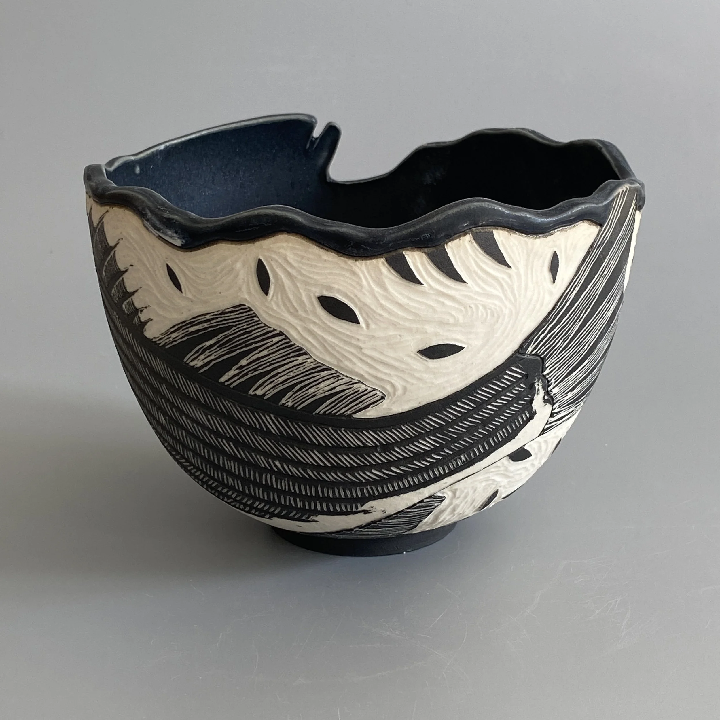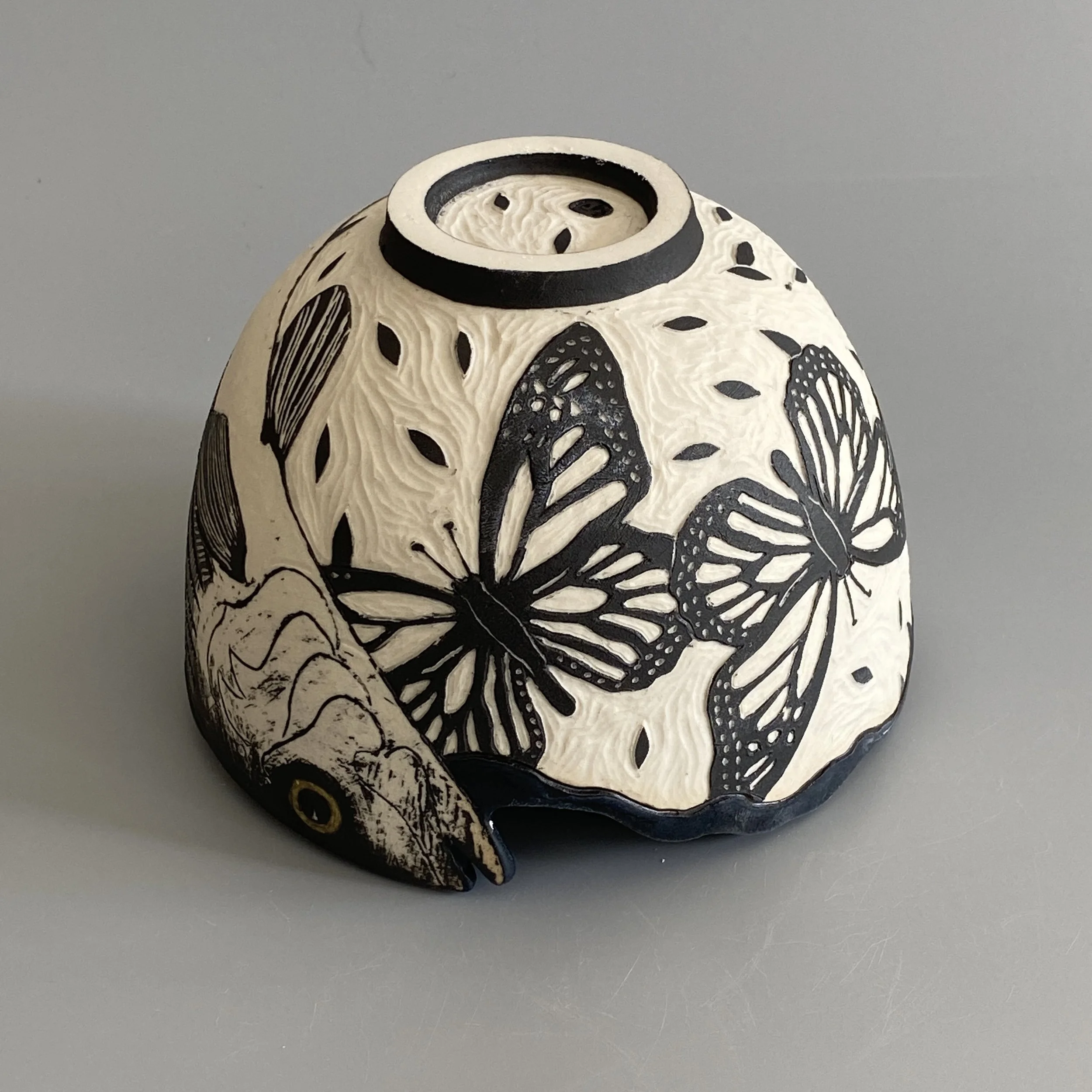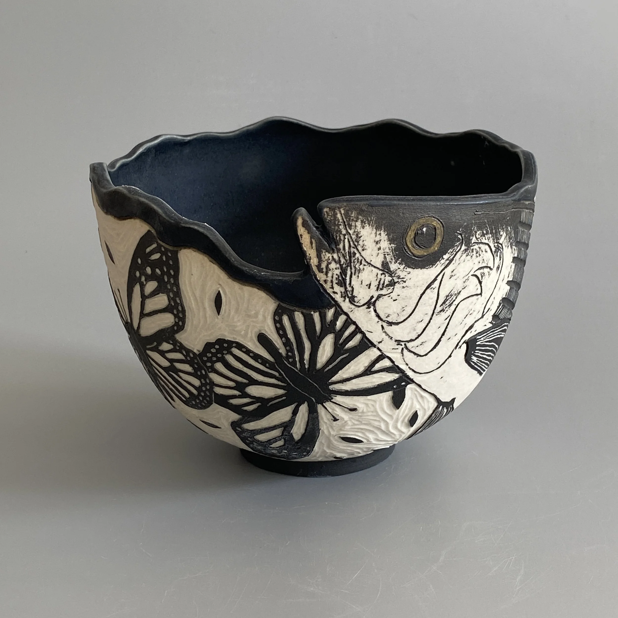 Shop › Striped Bass with Monarchs Image 1 of 3 Image 2 of 3 Image 3 of 3 Striped Bass with Monarchs $200.00 Porcelain bowl with sgraffito drawing. Black interior glaze. Food safe. Add To Cart Added! Porcelain bowl with sgraffito drawing. Black interior glaze. Food safe.